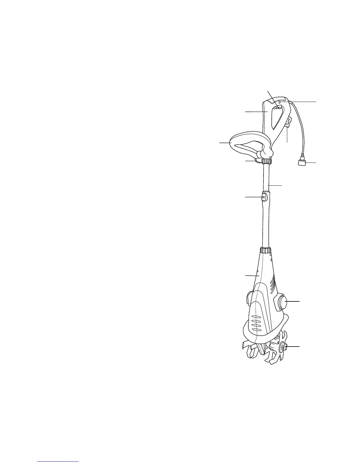 below to the electric garden cultivator in order to familiarize yourself with the location of the various controls and adjustments.