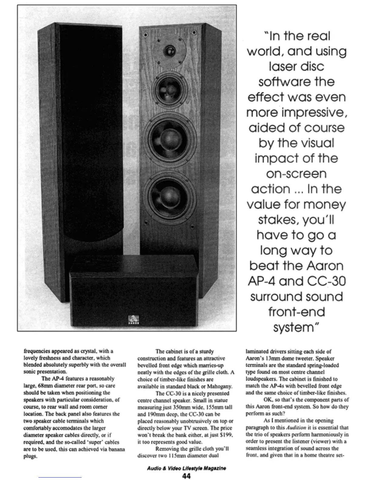 Aaron AP-4 - AP-4 Floorstanding Speaker Features; CC-30 Centre Channel Speaker Details
