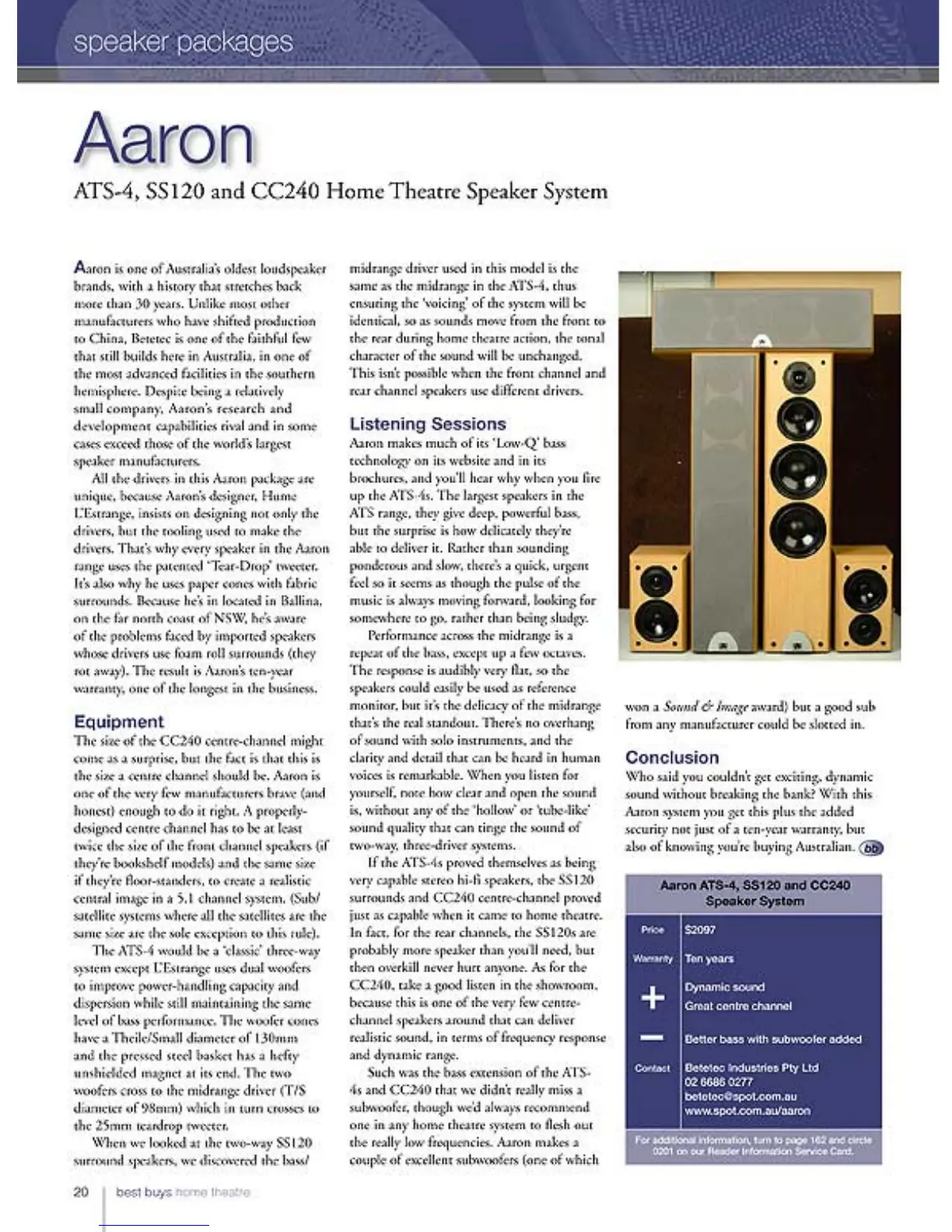 Aaron ATS-4 - Aaron ATS-4, SS120 and CC240 Speaker System Review; Equipment Specifications and Design; Listening Performance and Audio Quality; Conclusion and Australian Origin