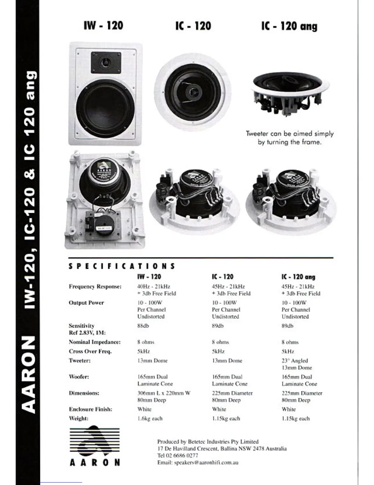Aaron IC-120 - Speaker Specifications and Features; IW-120 Detailed Specifications; IC-120 Detailed Specifications; IC-120 ang Detailed Specifications