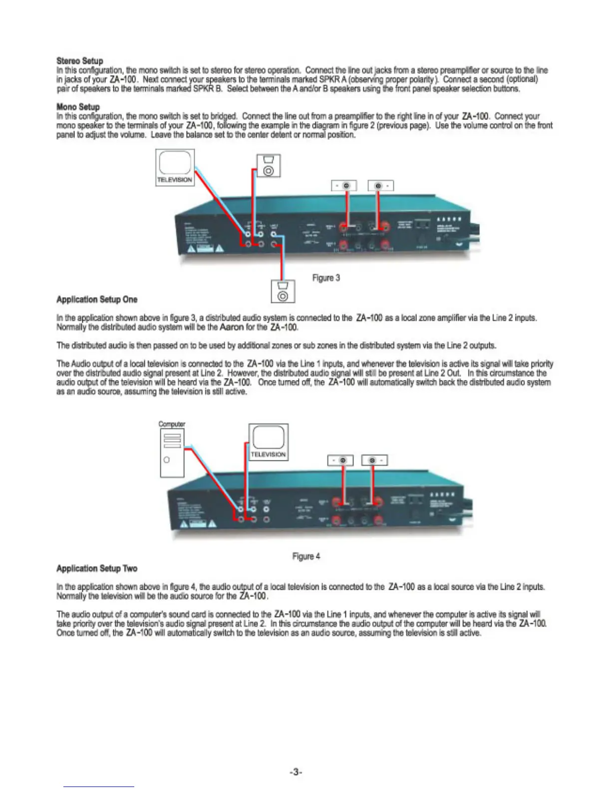 Aaron ZA-100 - Stereo Setup; Mono Setup; Application Setup One; Application Setup Two