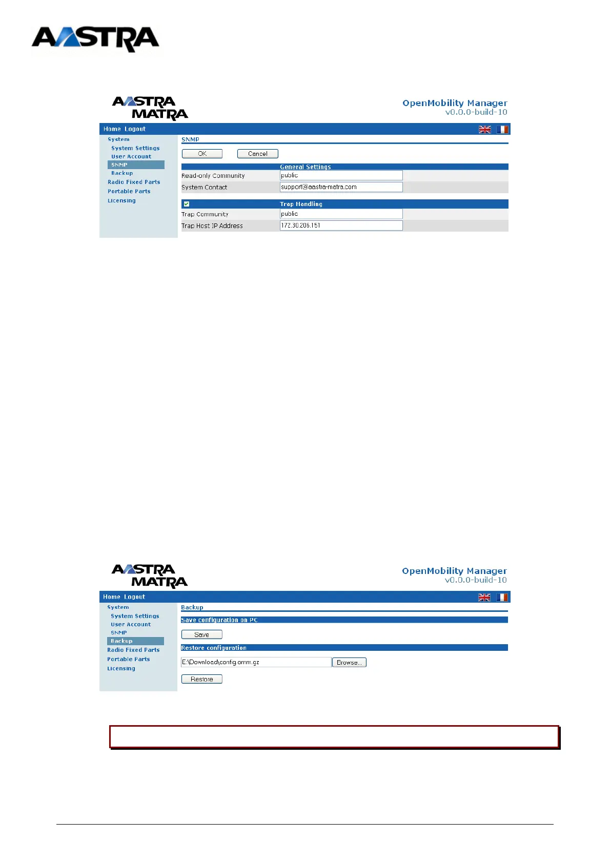 Restoring a previously saved configuration will lead to a reset of the OMM to take effect.