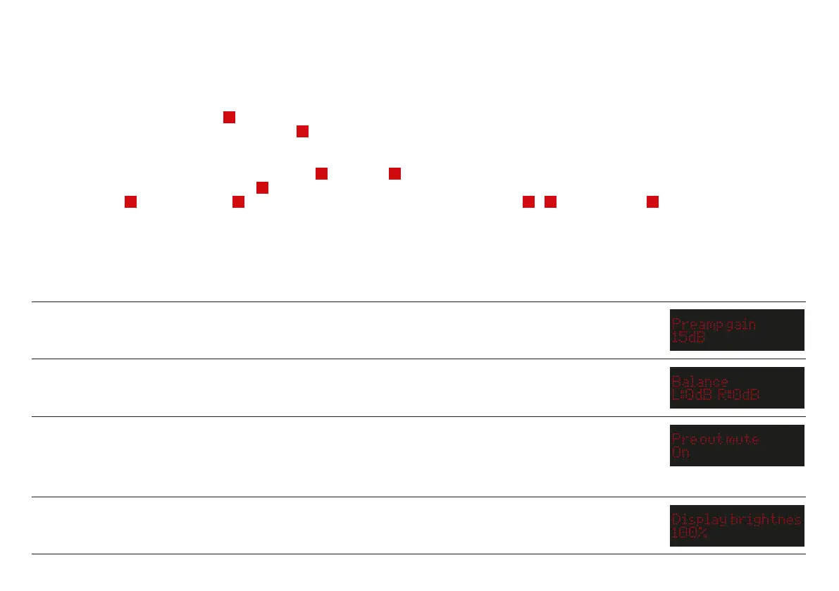 When entering the menu, the gain setting of the current input will be shown on the display. The top line of the display shows the current option (“Preamp gain” when entering