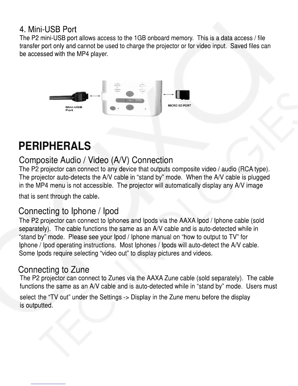 The P2 projector can connect to Zunes via the AAXA Zune cable (sold separately). The cable