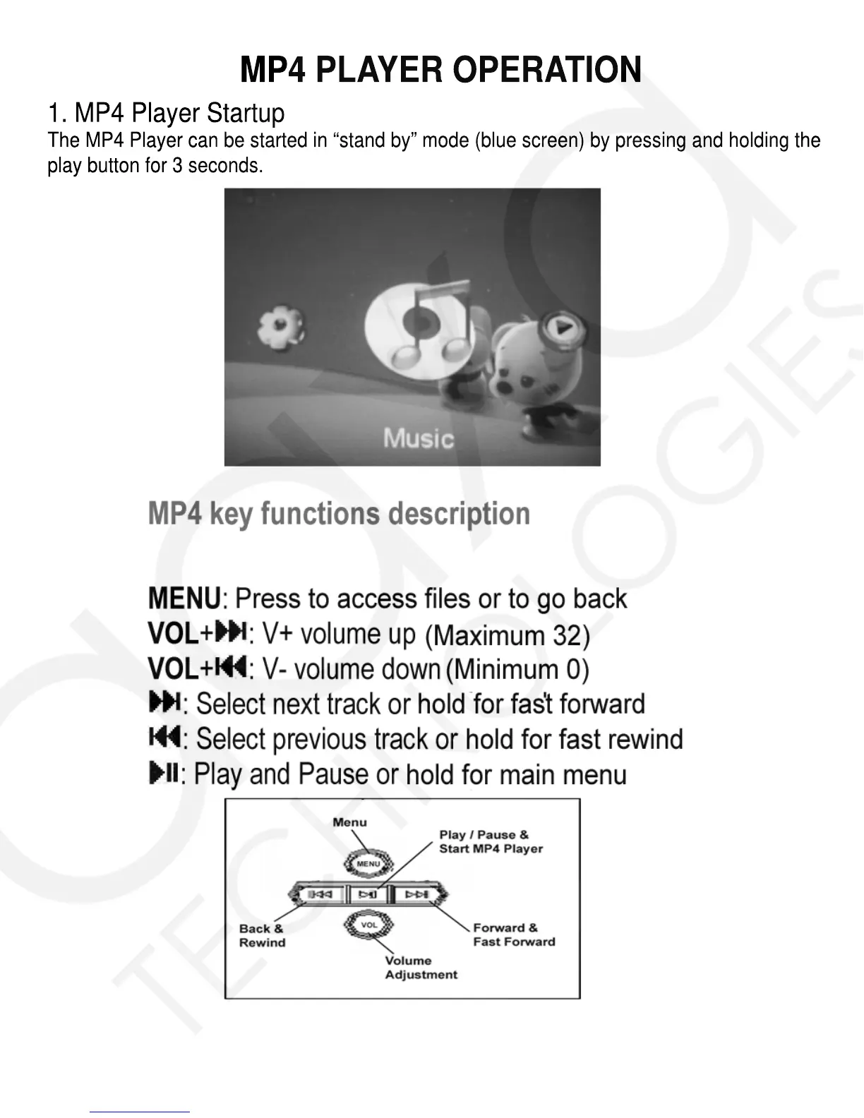 The MP4 Player can be started in “stand by” mode (blue screen) by pressing and holding the
