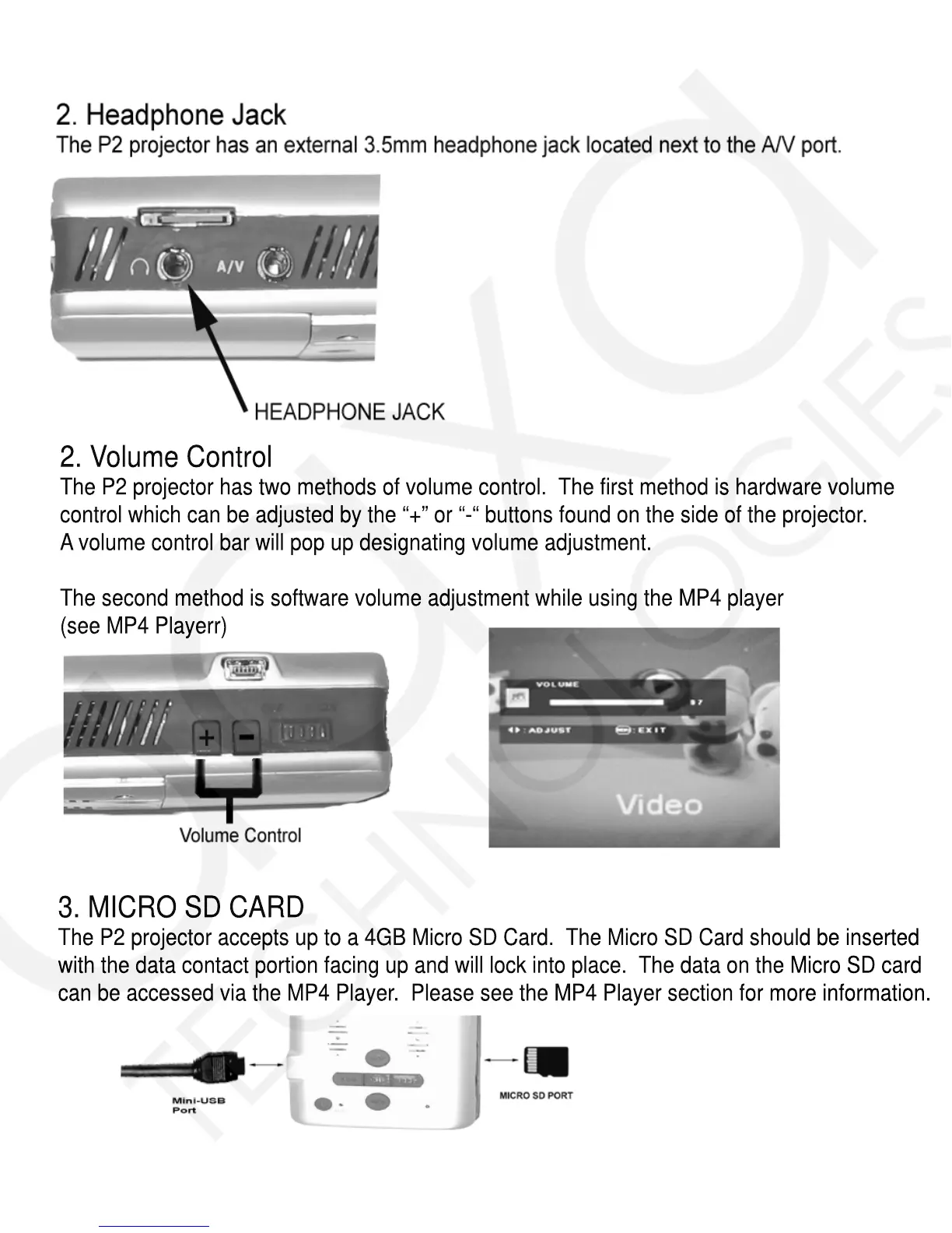 The P2 projector accepts up to a 4GB Micro SD Card. The Micro SD Card should be inserted