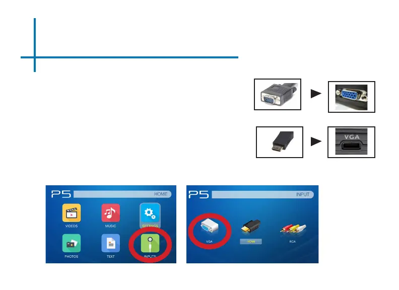 In the Main Menu Select the “Inputs” icon and then the “VGA” Icon.