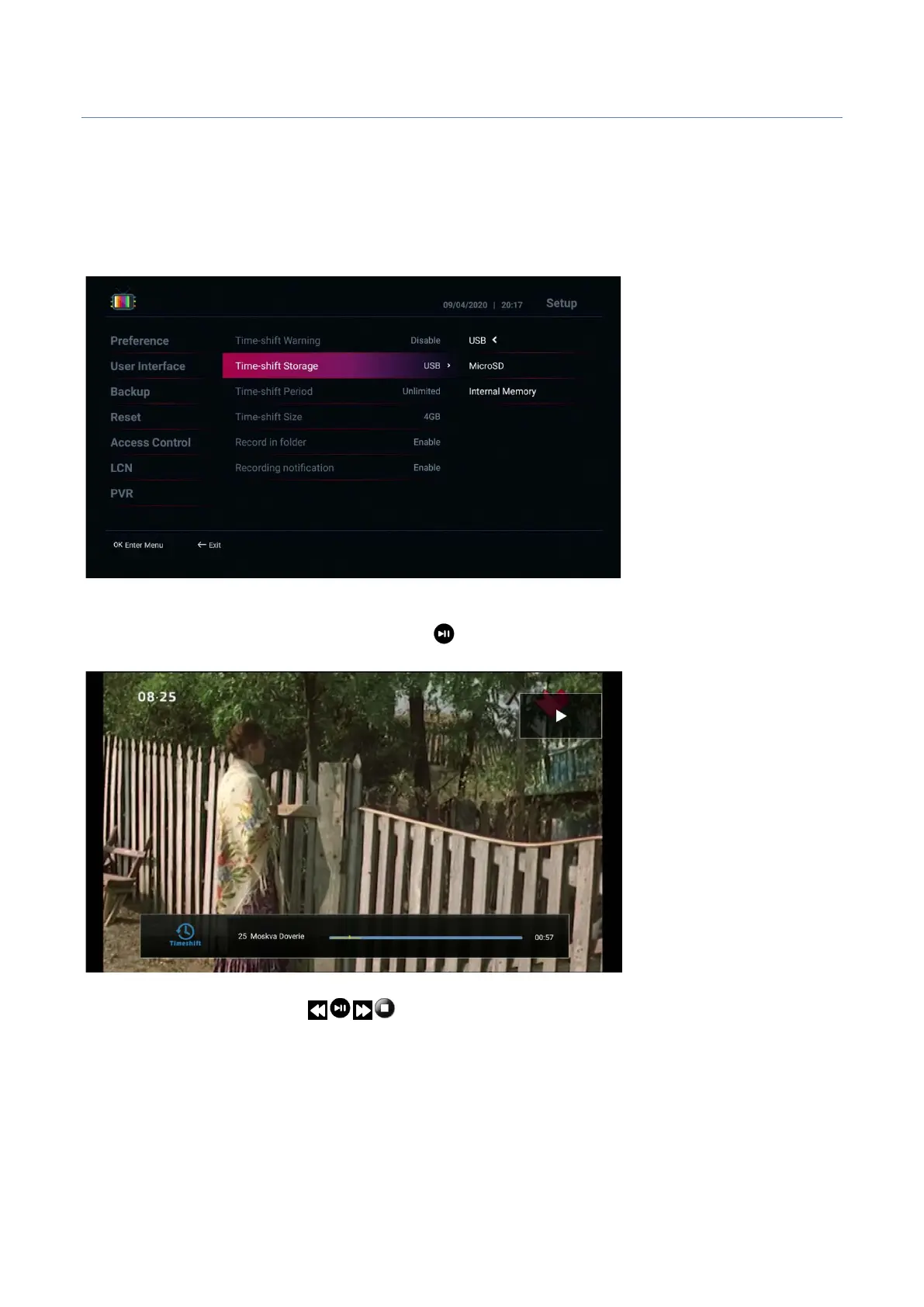 To use time shift function, in Live TV mode, press “ ” button then you can enter time shift mode