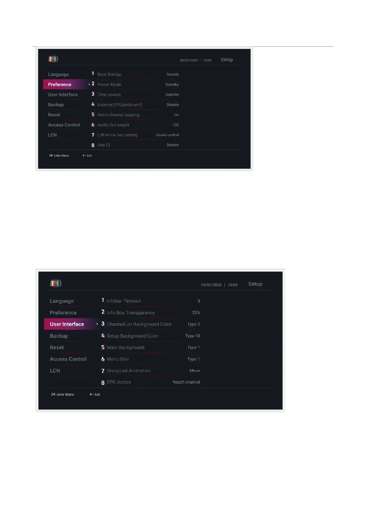 1. Infobar Timeout : Set the time the infobar disappears when switching channels. (You can specify from 1 to