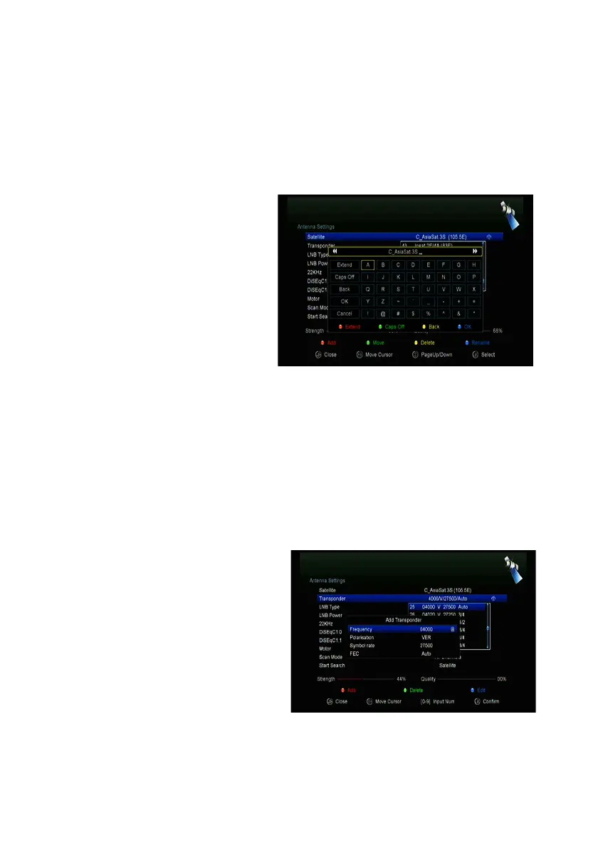 You can press the RED button to add a transponder. Here you can input new