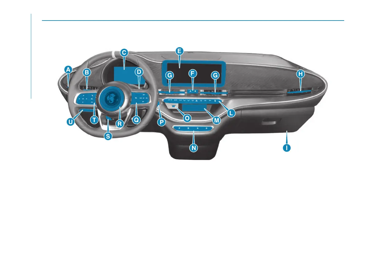 warning lights, door locking/unlocking button G. central air vents H. side air vent I. glove compartment L. climate control system