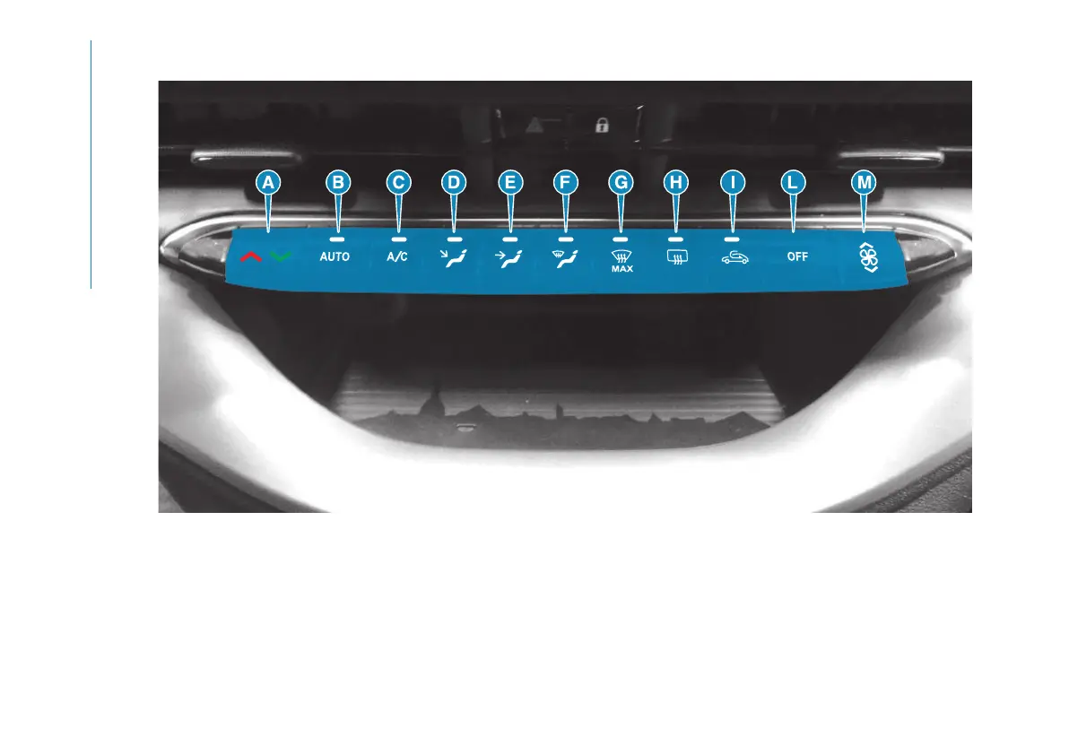 on/off button H. heated rear window on/off button I. internal air recirculation on/off button L. climate control system on/off