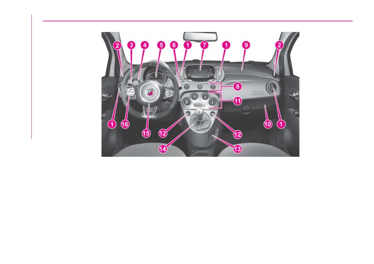 9. Passenger frontairbag 10. Glove compartment 11. Climatecontrol system buttons 12. Electric windows 13. Storage