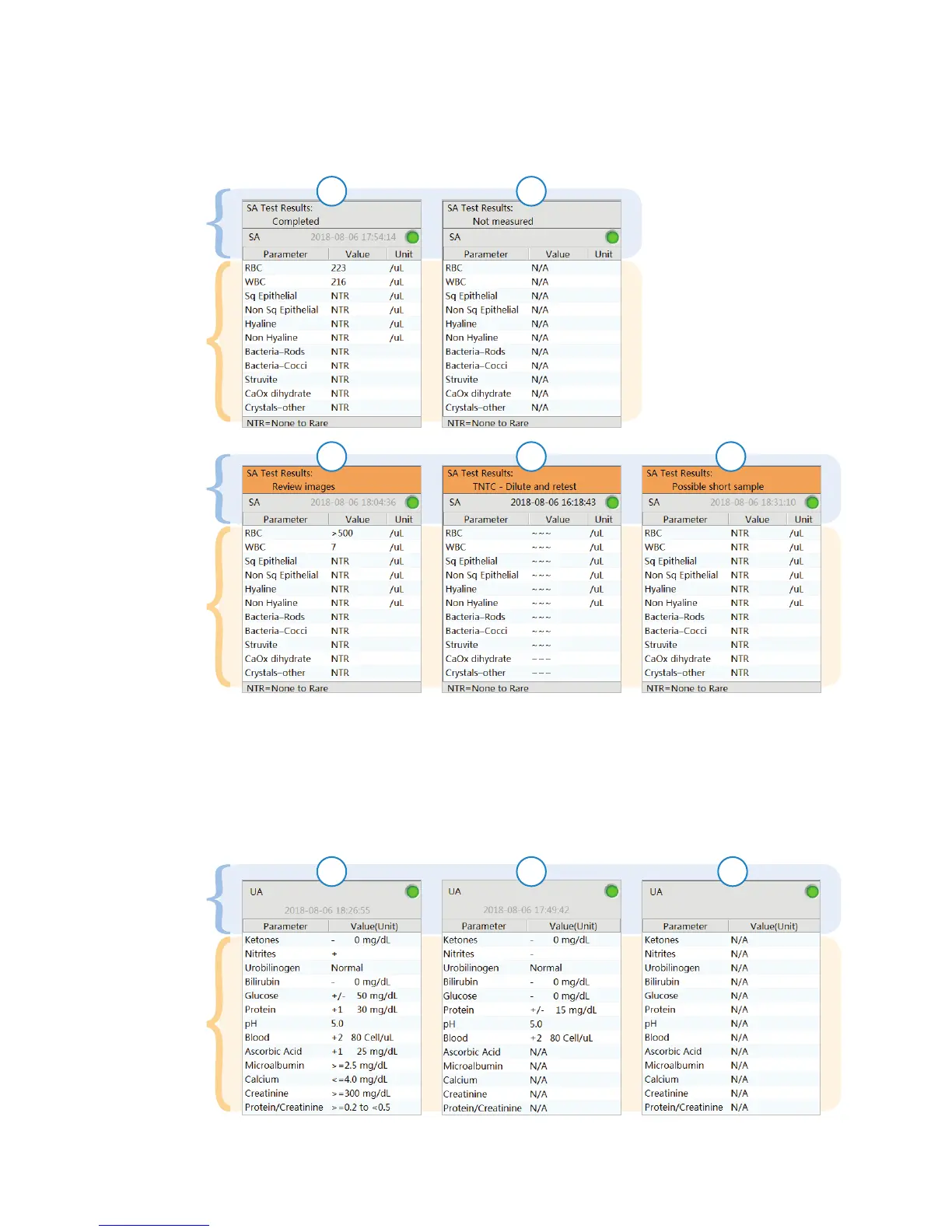 SA Results Panel Examples (1) Results with No Warnings, (2) No SA test measured where N/A represents Not Applicable, (3)