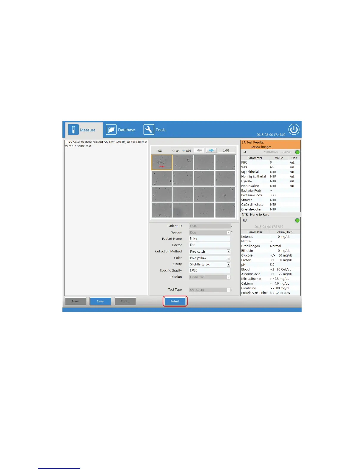 patient entry. The retest function is only available for the SA test. If a UA test was also