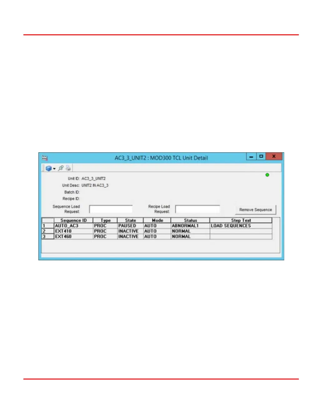 load request, a field for entering a recipe load request, and a Remove Sequence