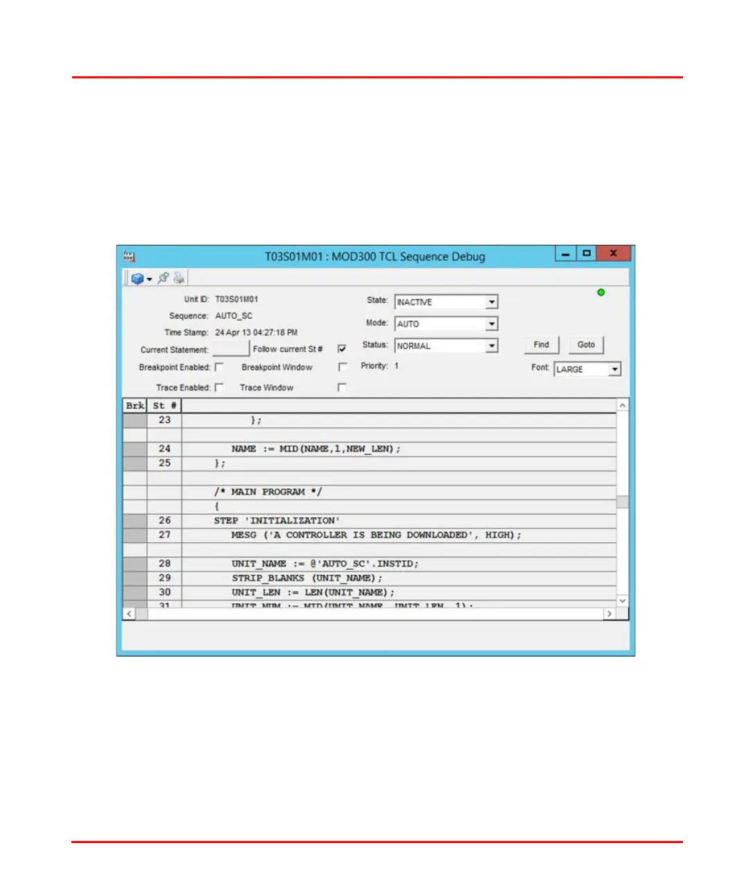 The Sequence Debug Display, Figure 38, supports runtime troubleshooting and