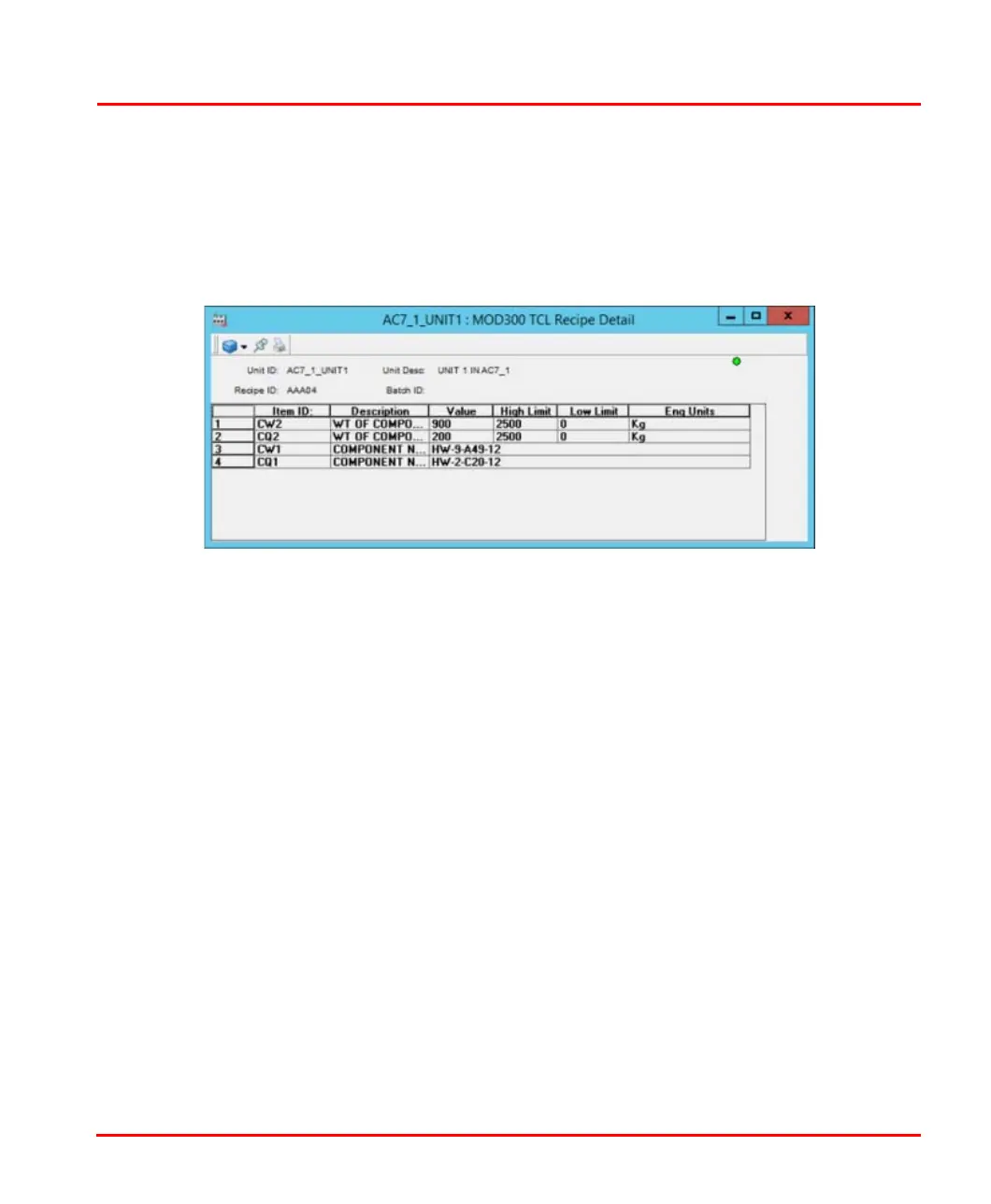 The unit ID, unit description, recipe ID, and batch ID are shown at the top of the