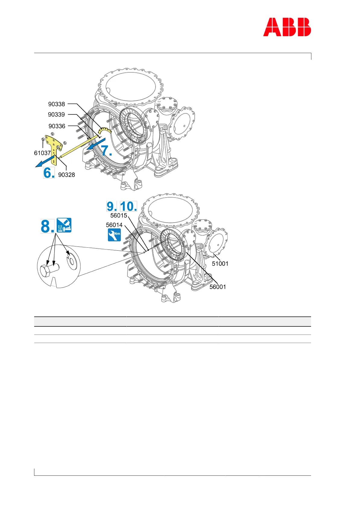 9. Fit the nozzle ring (56001) on the gas inlet casing (51001) using the screws (56014) and