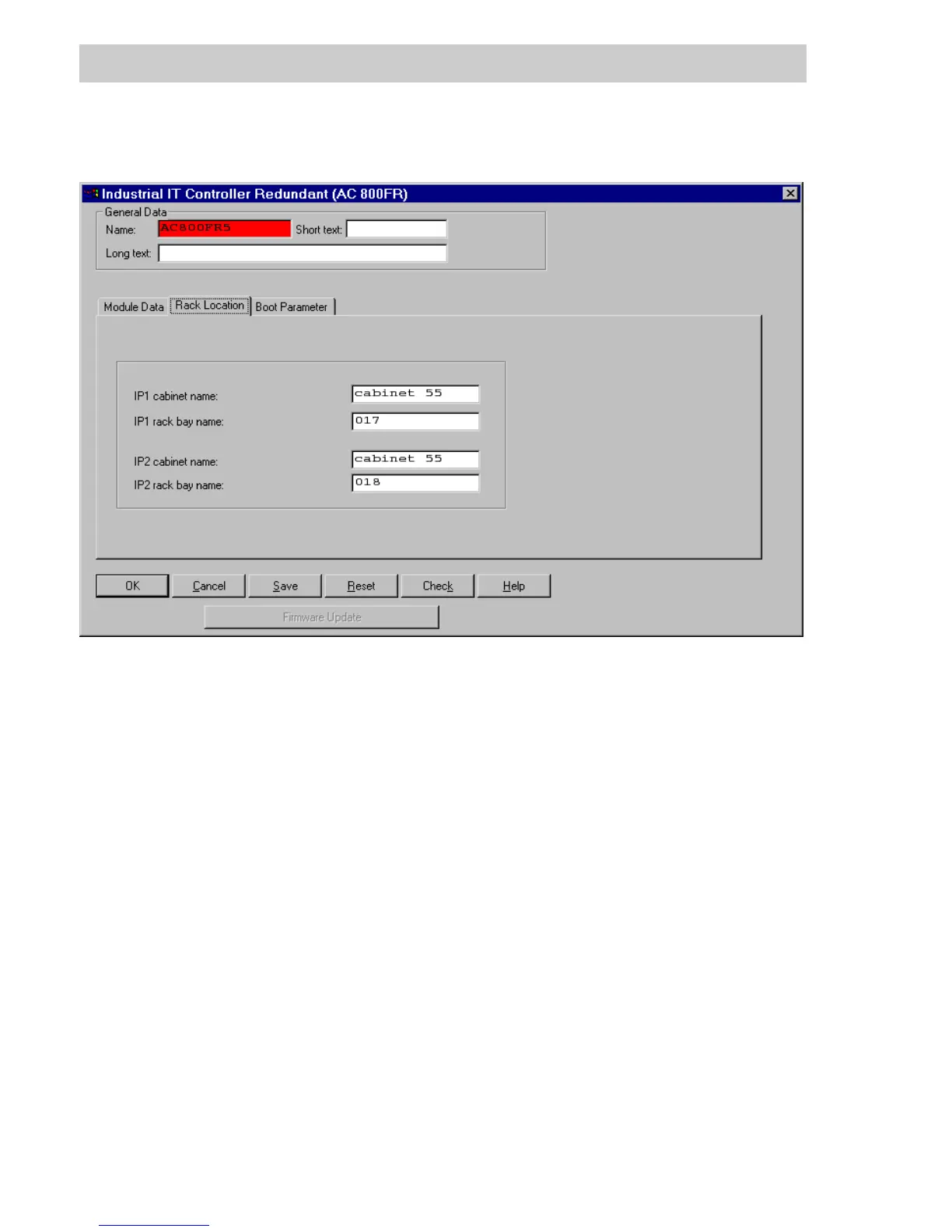 Rack bay name Optional text details of rack bay identifier for FieldController
