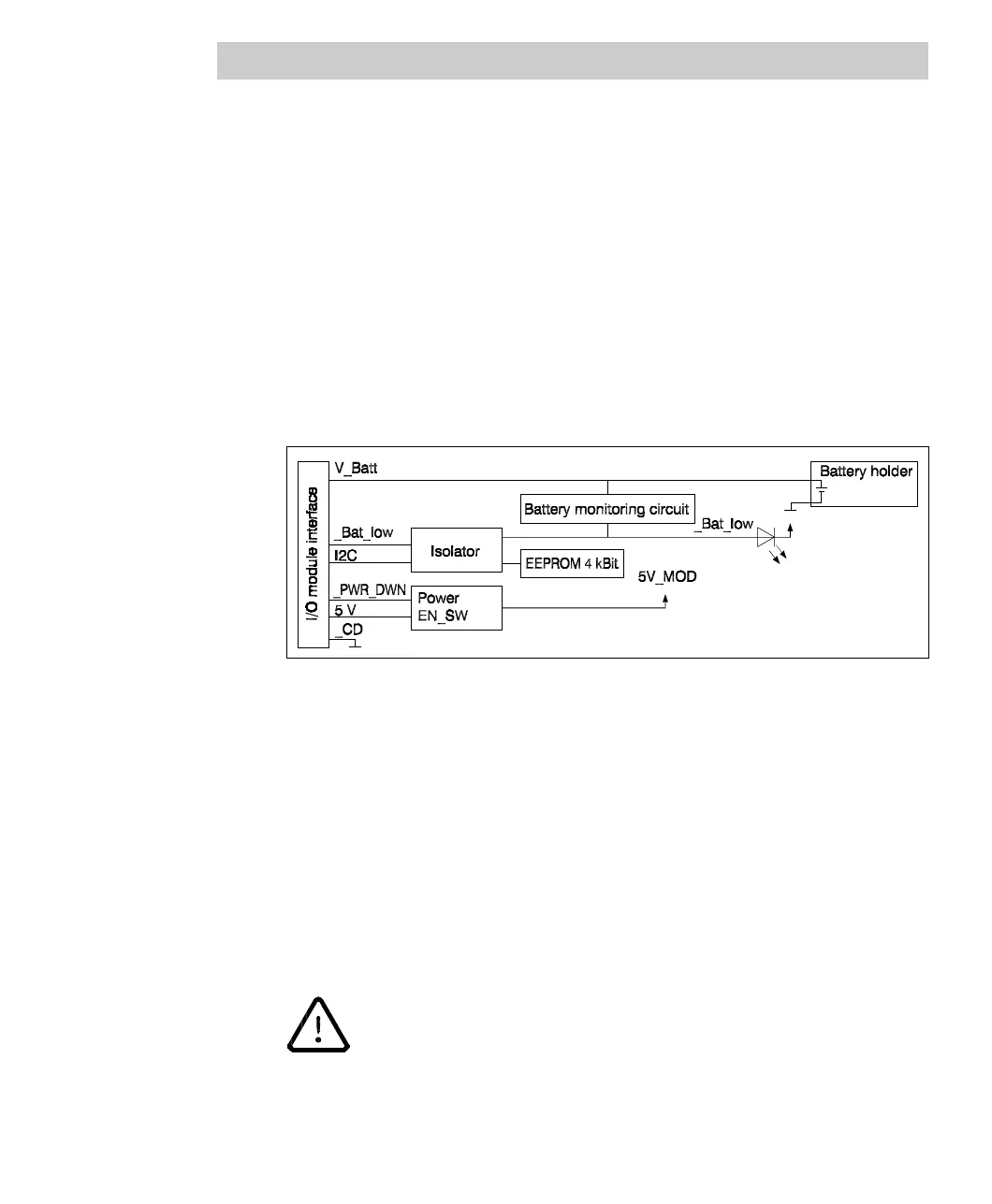 • Battery status monitoring circuit with Batt low signal and yellow status indicator
