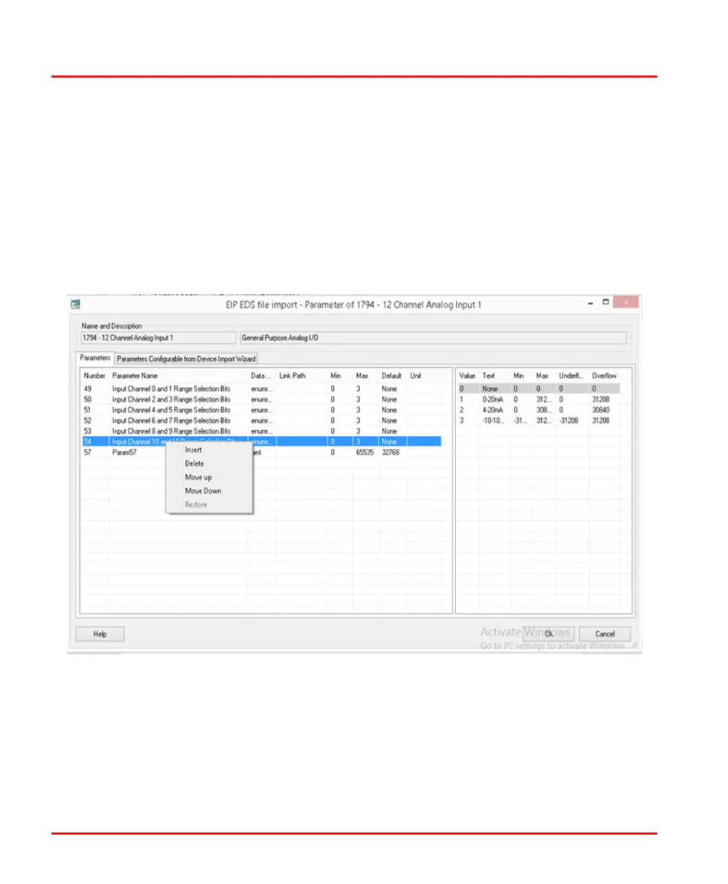 Depending on the EDS file being imported, the “Customize” window for Parameter