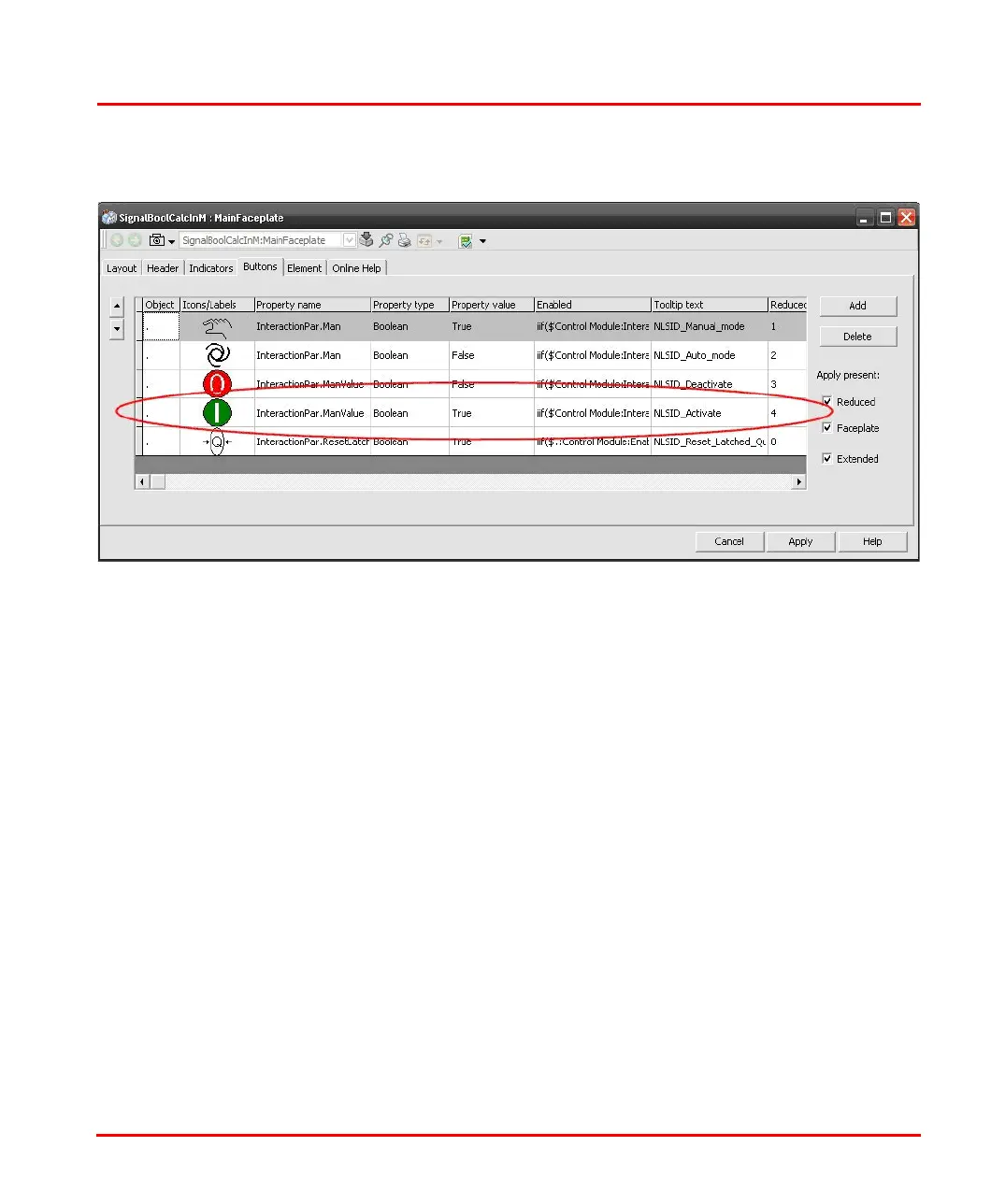 Figure 25. Faceplate button configuration showing associated Property Name and