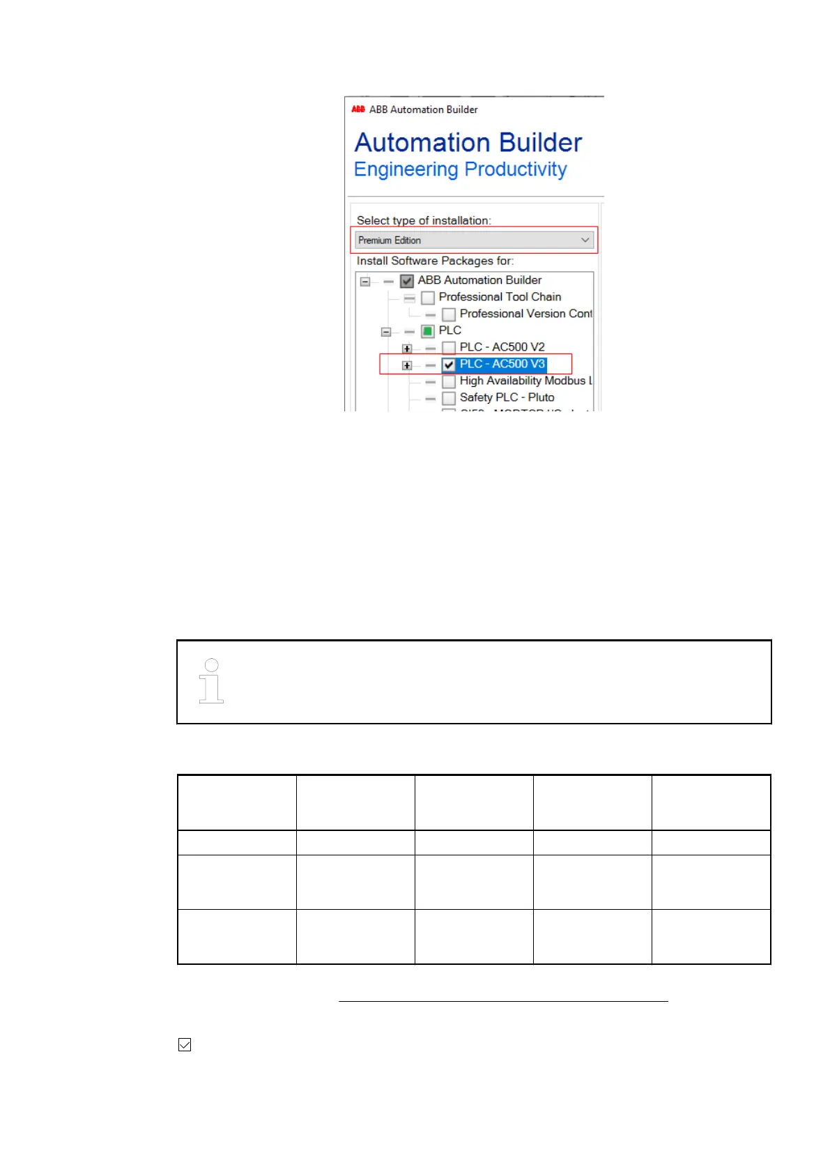 Enable the check box “PLC - AC500 V3” to activate installation of all options for AC500