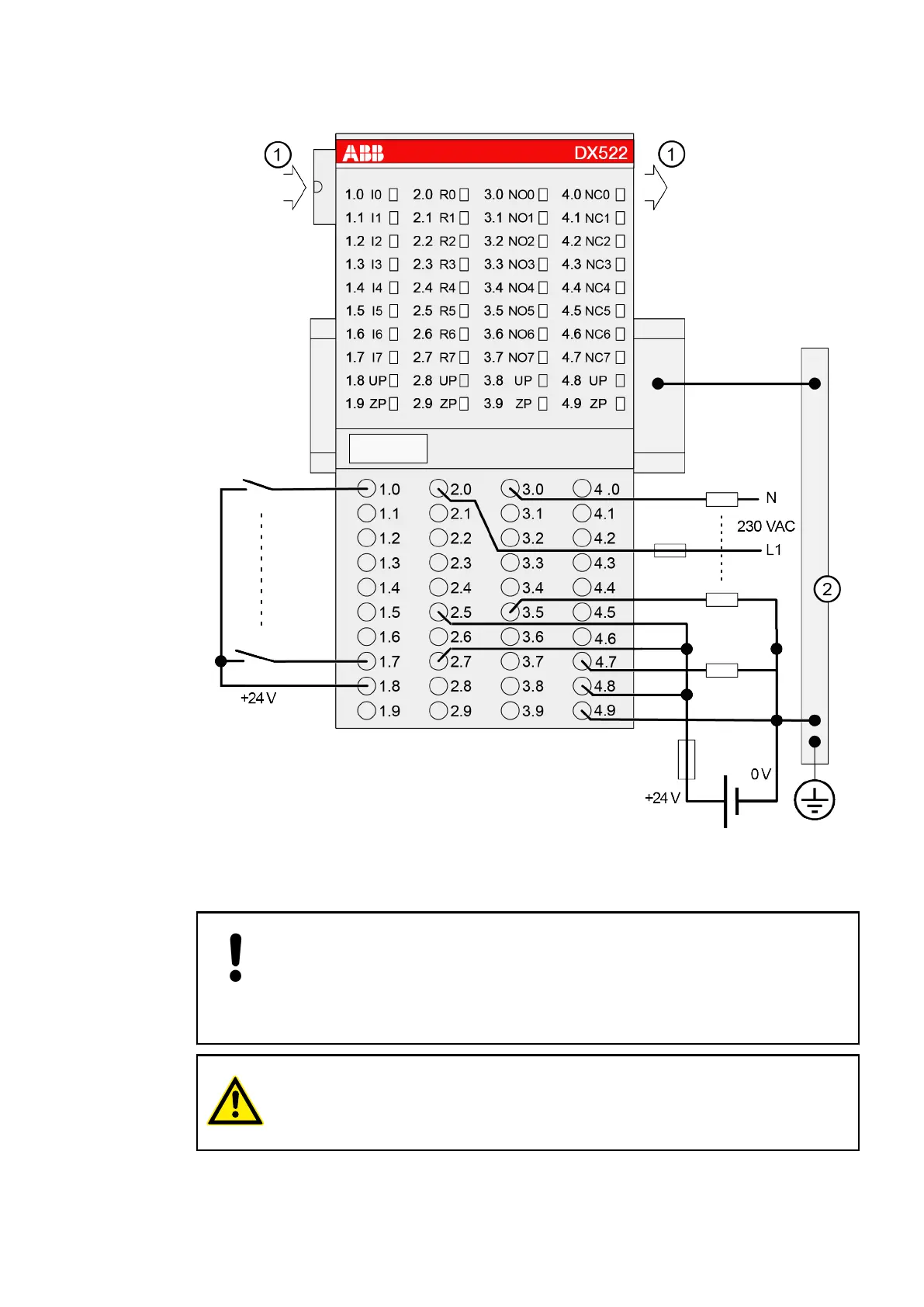 The following figure shows the electrical connection of the digital input/output module DX522.