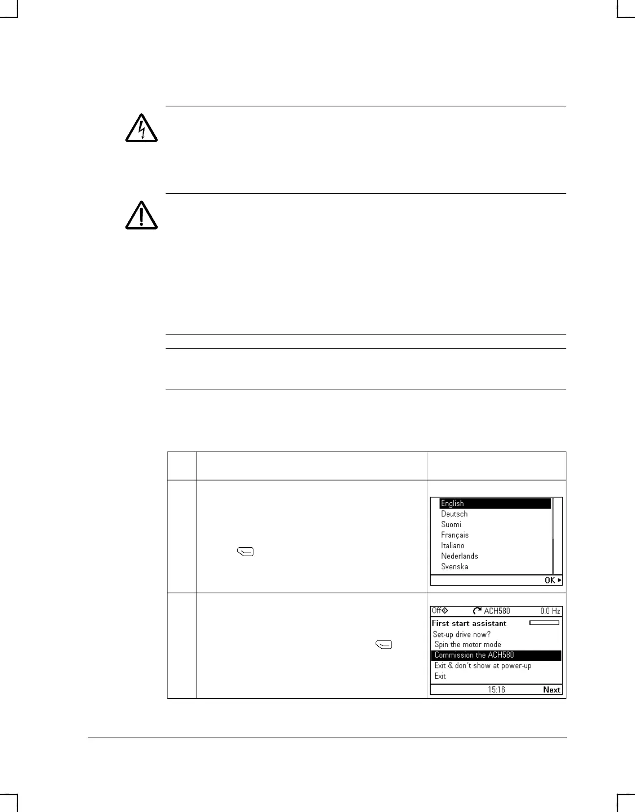1. Make First start assistant-guided settings: Language, motor nominal values, and
