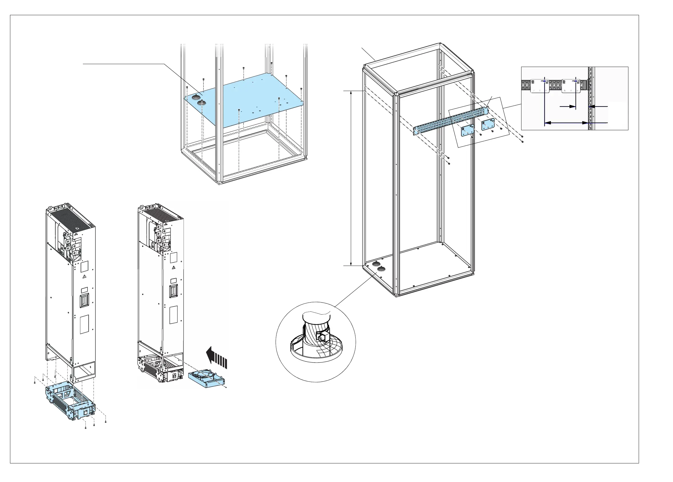 10 Step-by-step drawings for an installation example of standard drive configuration in Rittal VX25 800 mm wide cabinet