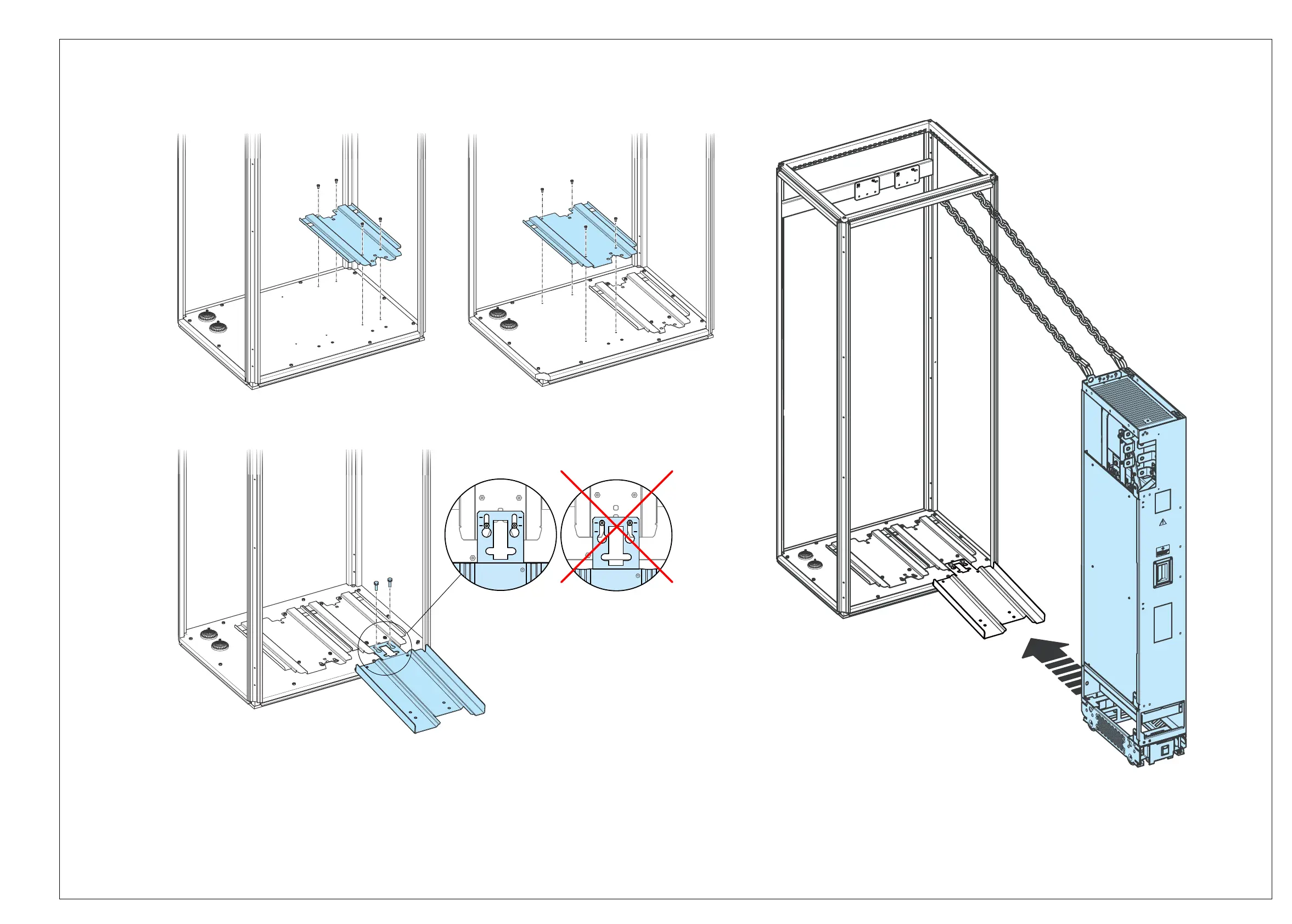 Step-by-step drawings for an installation example of standard drive configuration in Rittal VX25 800 mm wide cabinet 11