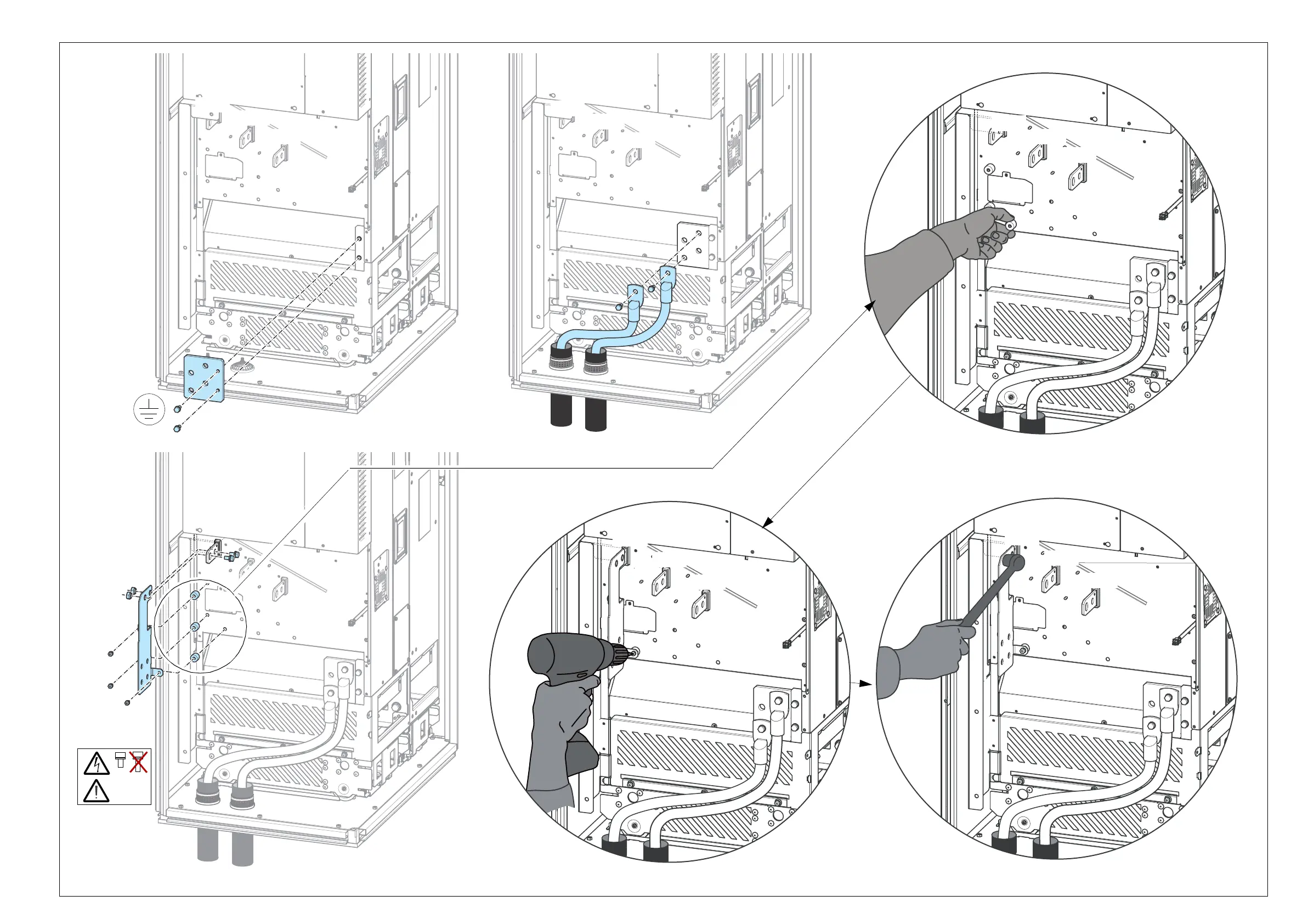 Step-by-step drawings for an installation example of standard drive configuration in Rittal VX25 800 mm wide cabinet 15