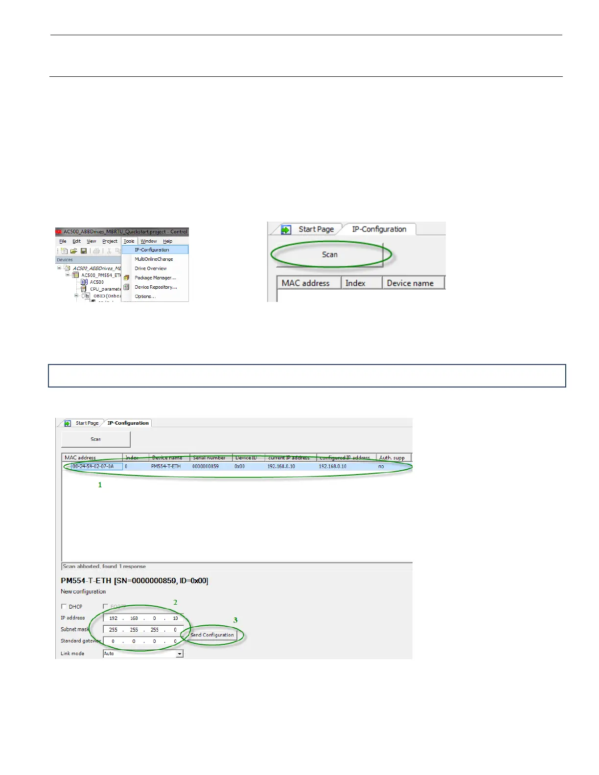 SelectactualPLCfromthescannedobjects(1),mak eyournetworksettings(2)andpressthe“SendConfiguration”