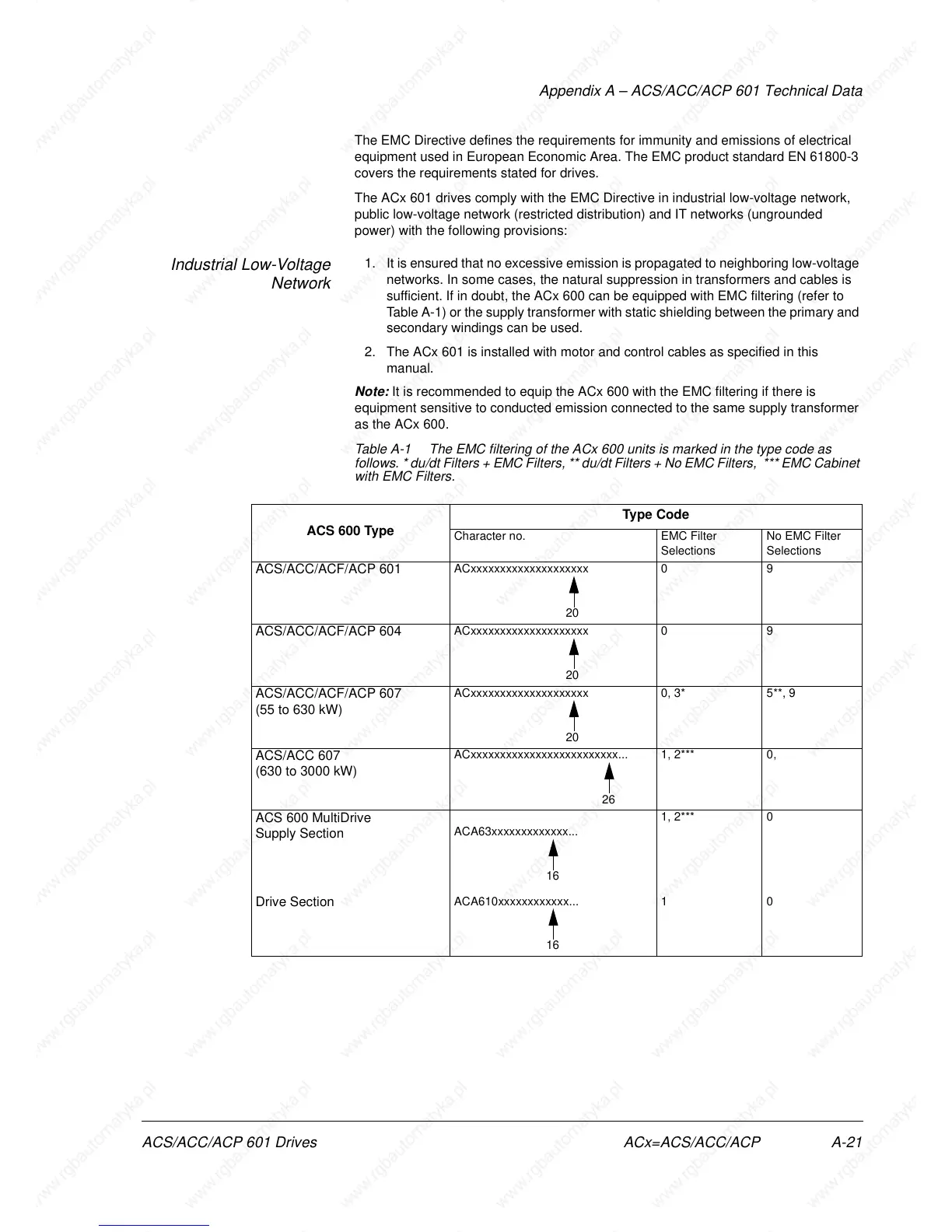 Table A-1 The EMC filtering of the ACx 600 units is marked in the type code as