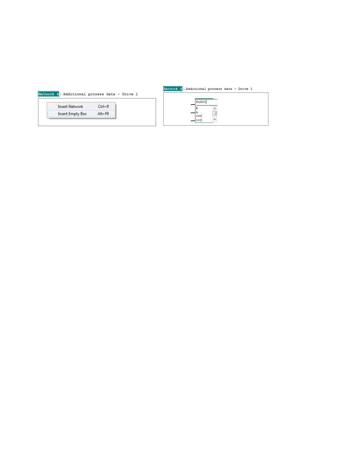 FC501 is used to send additional process data between the PLC and the drive. Insert a new Empty Box