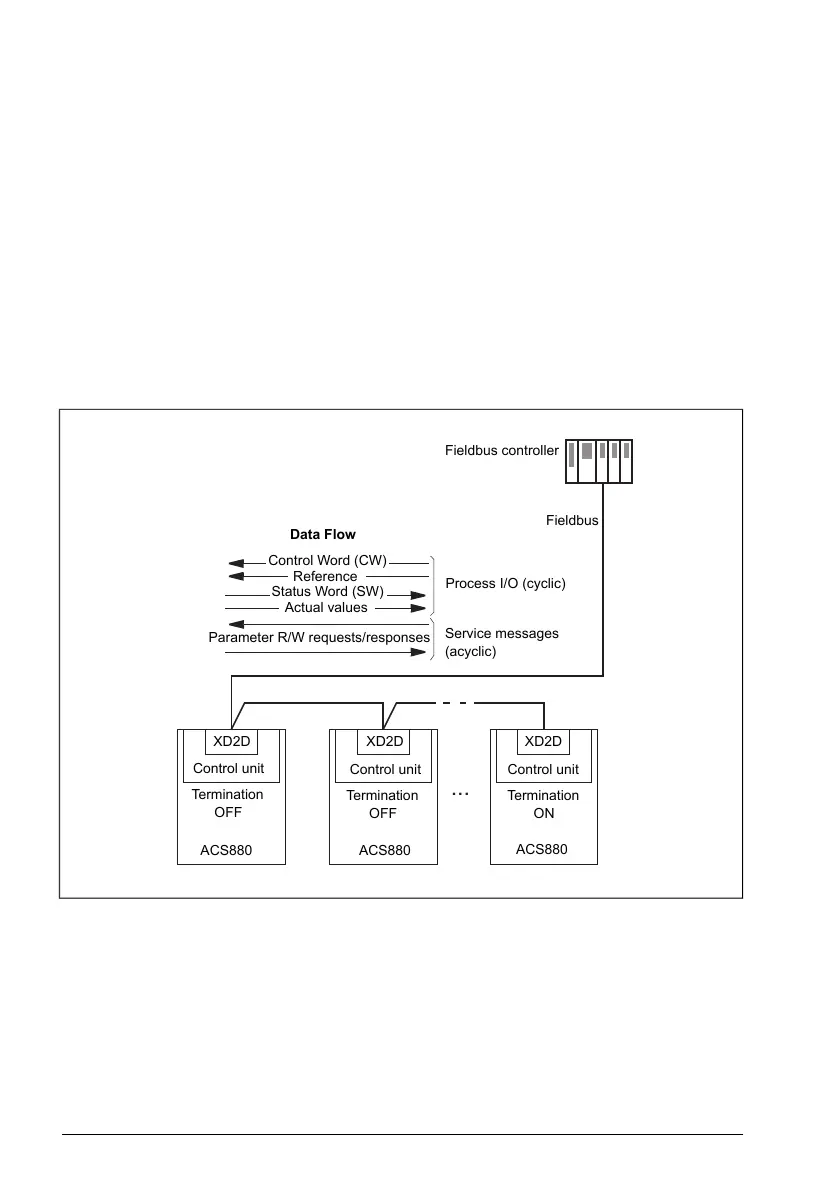 Connect the fieldbus to terminal XD2D on the control unit of the drive. See the appropriate