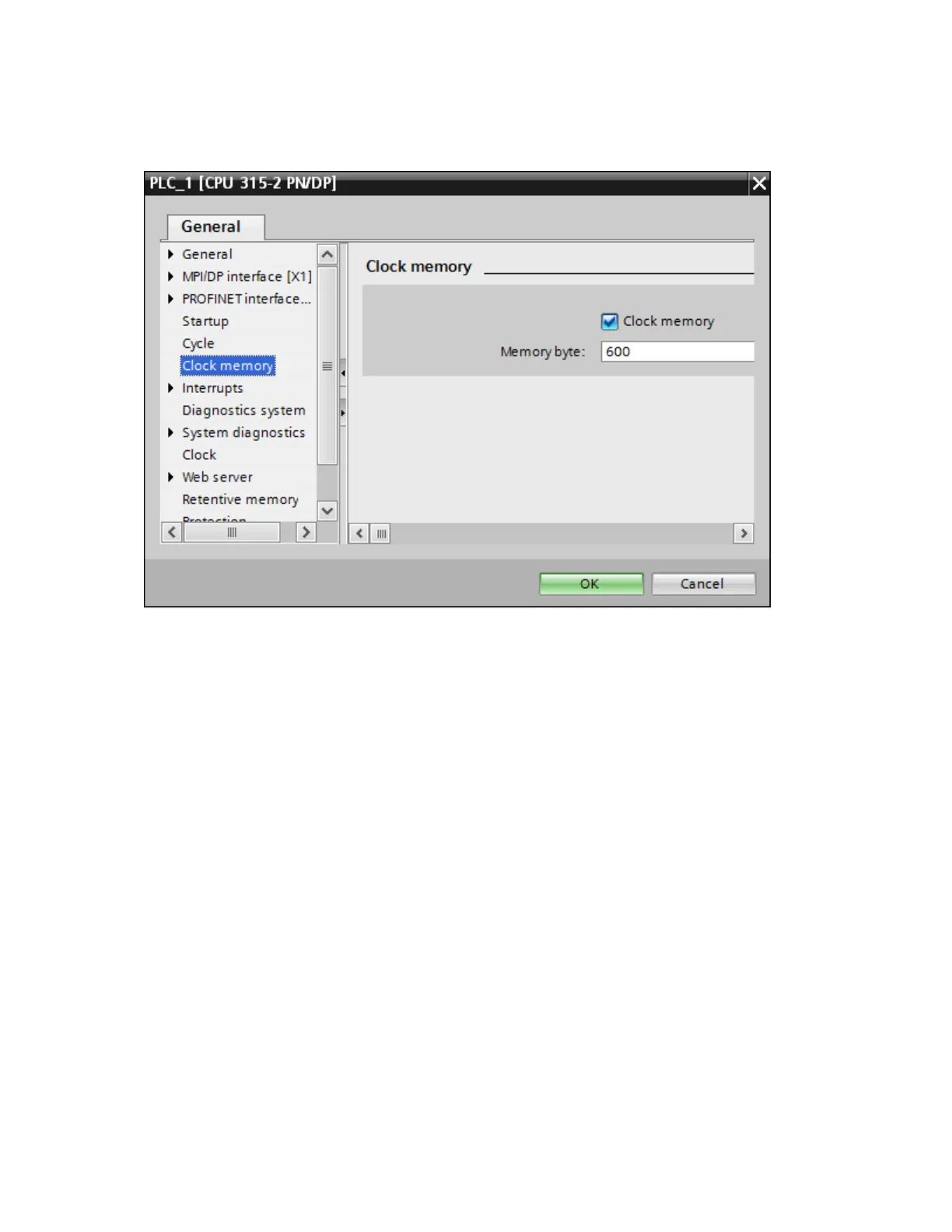 5. In the PLC_1 (CPU) window, click Clock memory and enable Clock memory, assign memory