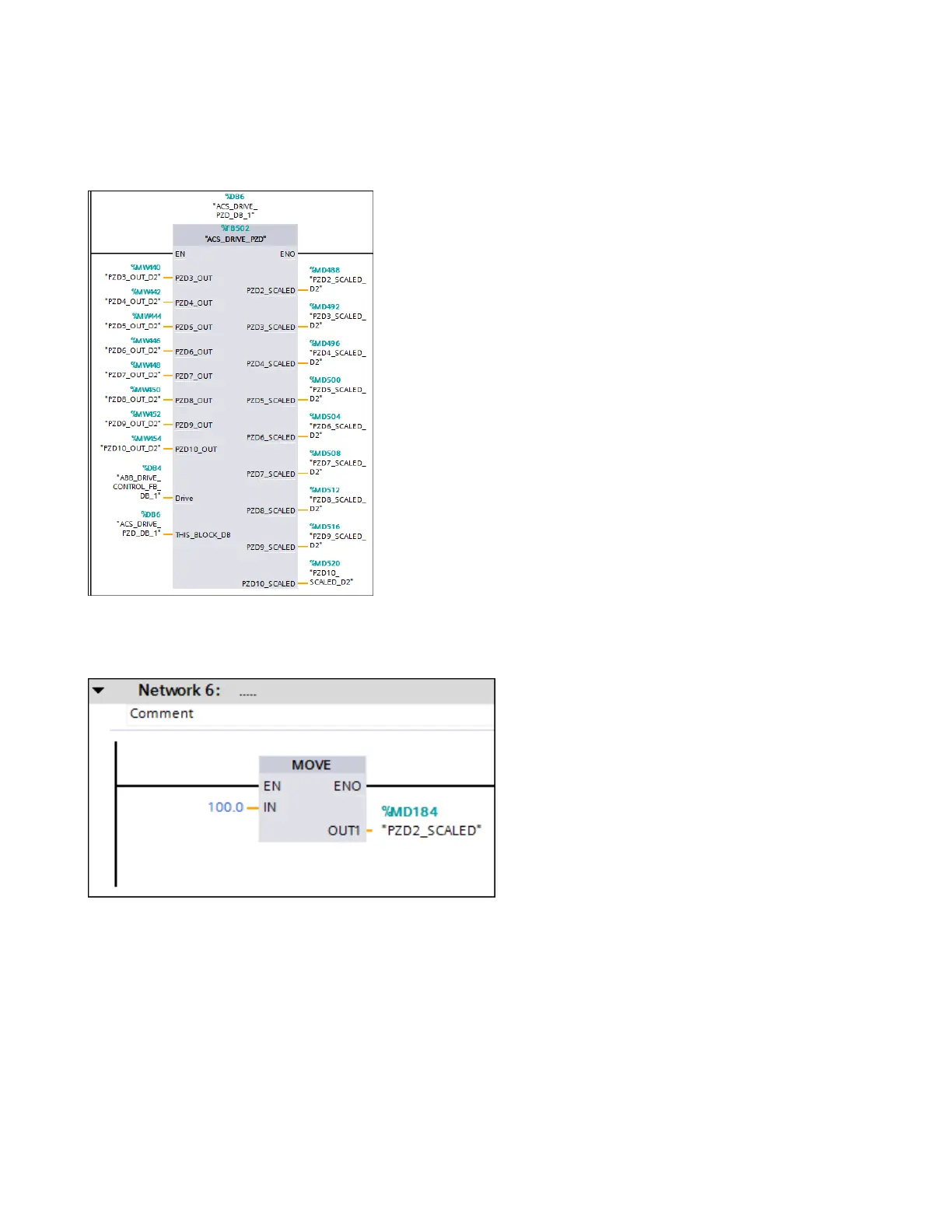 ACS_DRIVE_PZD block. See example below where PZD3 is scaled with the value 100.