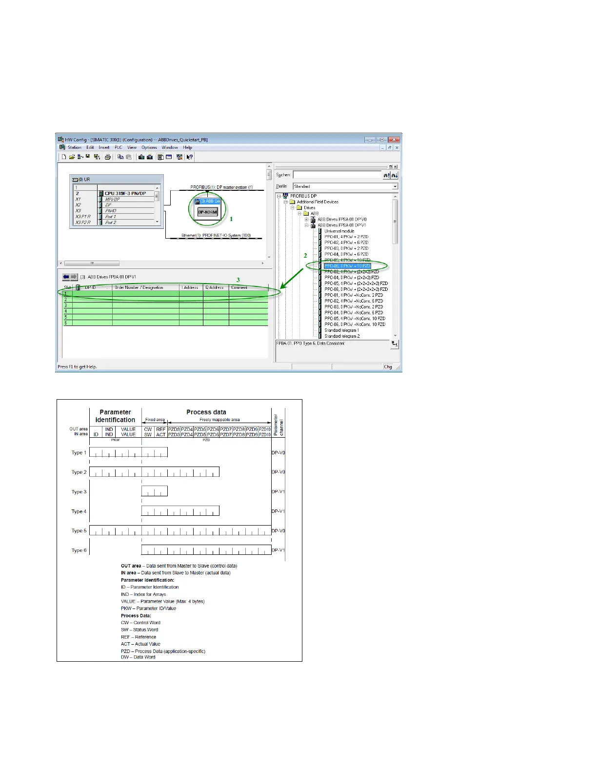 Select the drive/PROFIBUS DP node (1), drag and drop desired PPO type (2) to slot 1 of the module (3).