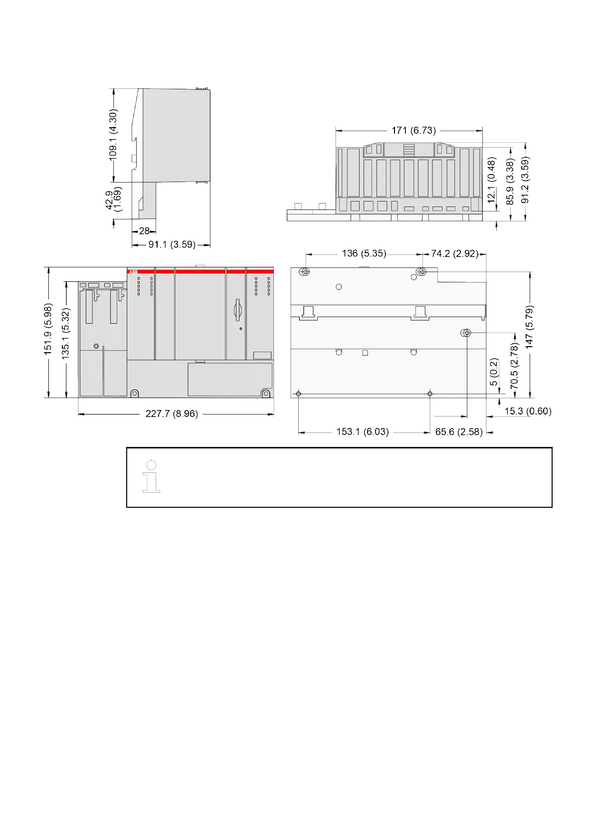 The dimensions are in mm and in brackets in inch.