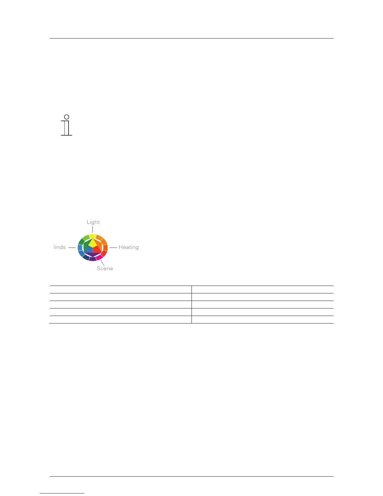 "Light", "Blinds", "Heating" and "Scenes" are illuminated in colour code (colour code on the operating surfaces) as