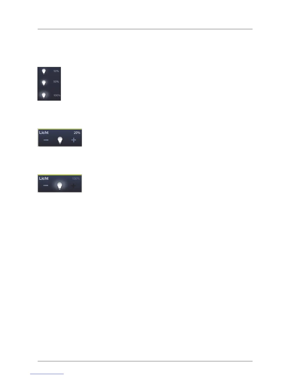 Default settings of steps (e.g. dimming steps, fan speed levels) are shown in white / bright lettering / icons. The