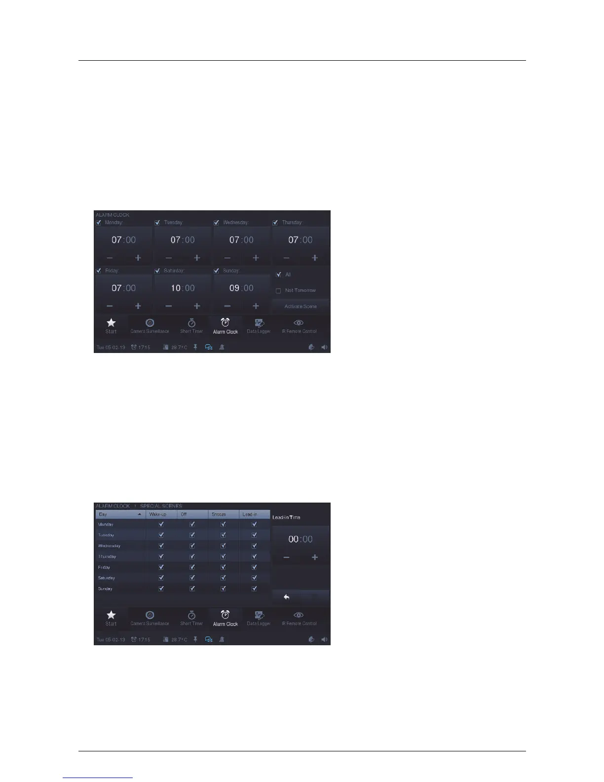 This allows a scene or a sequence to be started for the lead-in time (specific time set before alarm time), for