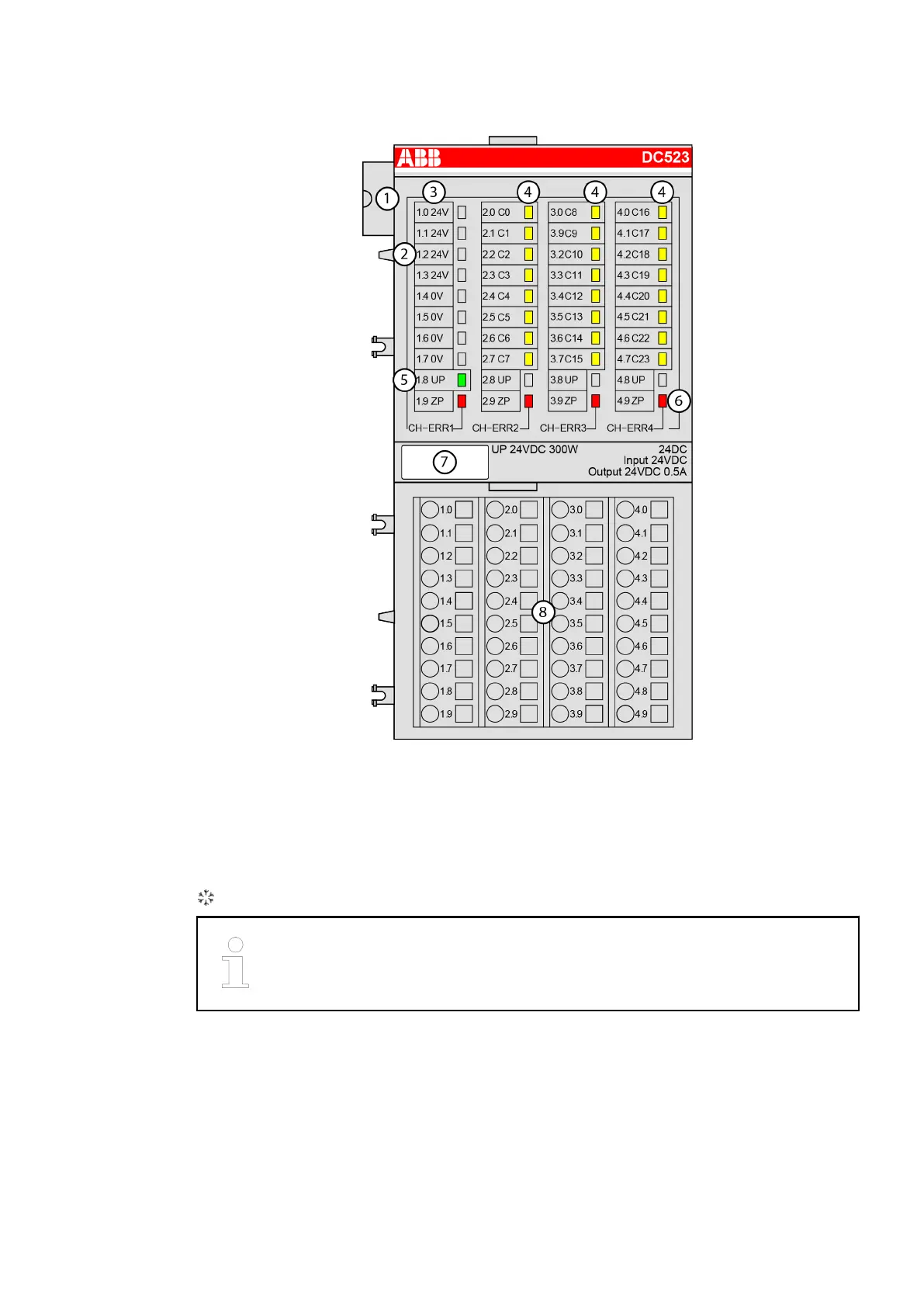 4 24 yellow LEDs to display the signal states at the digital inputs/outputs (C0 - C23)