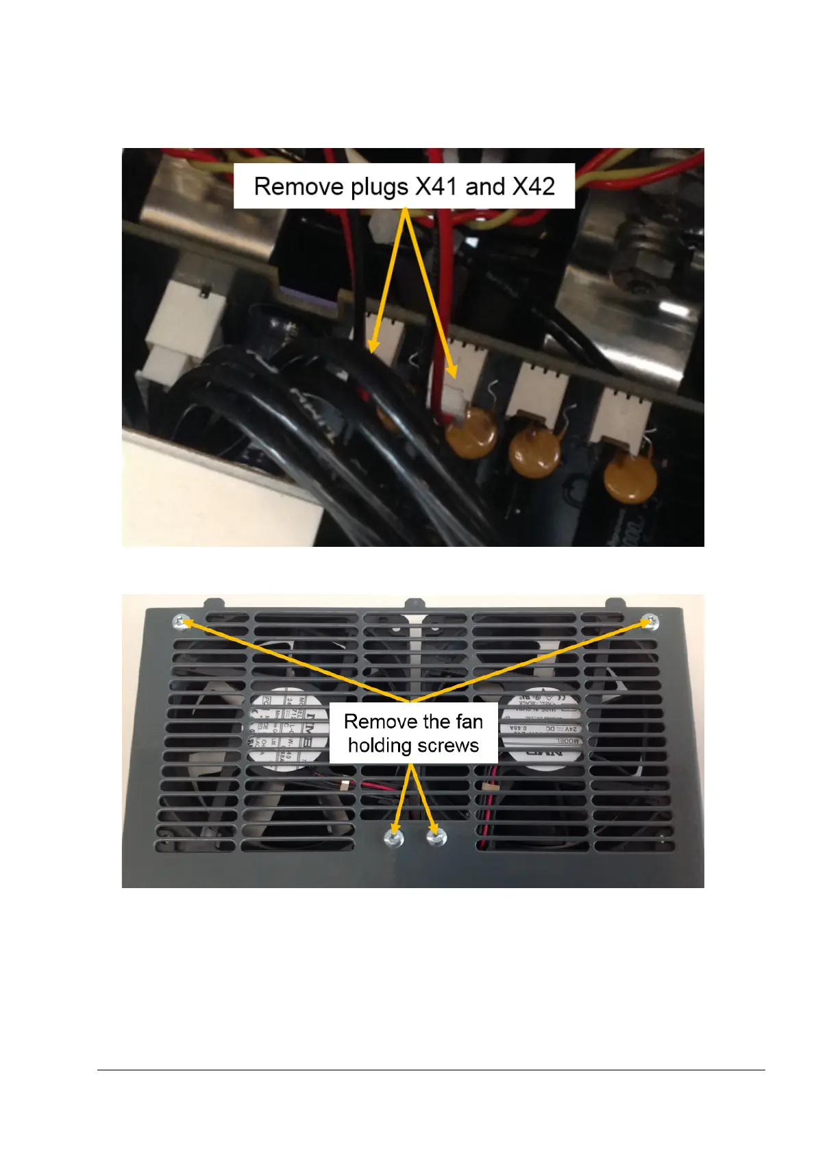 ABB DCT880 - Fan Plug and Screw Removal; Remove fan plugs (X41, X42) from SDCS-PIN-H; Remove fan holding screws