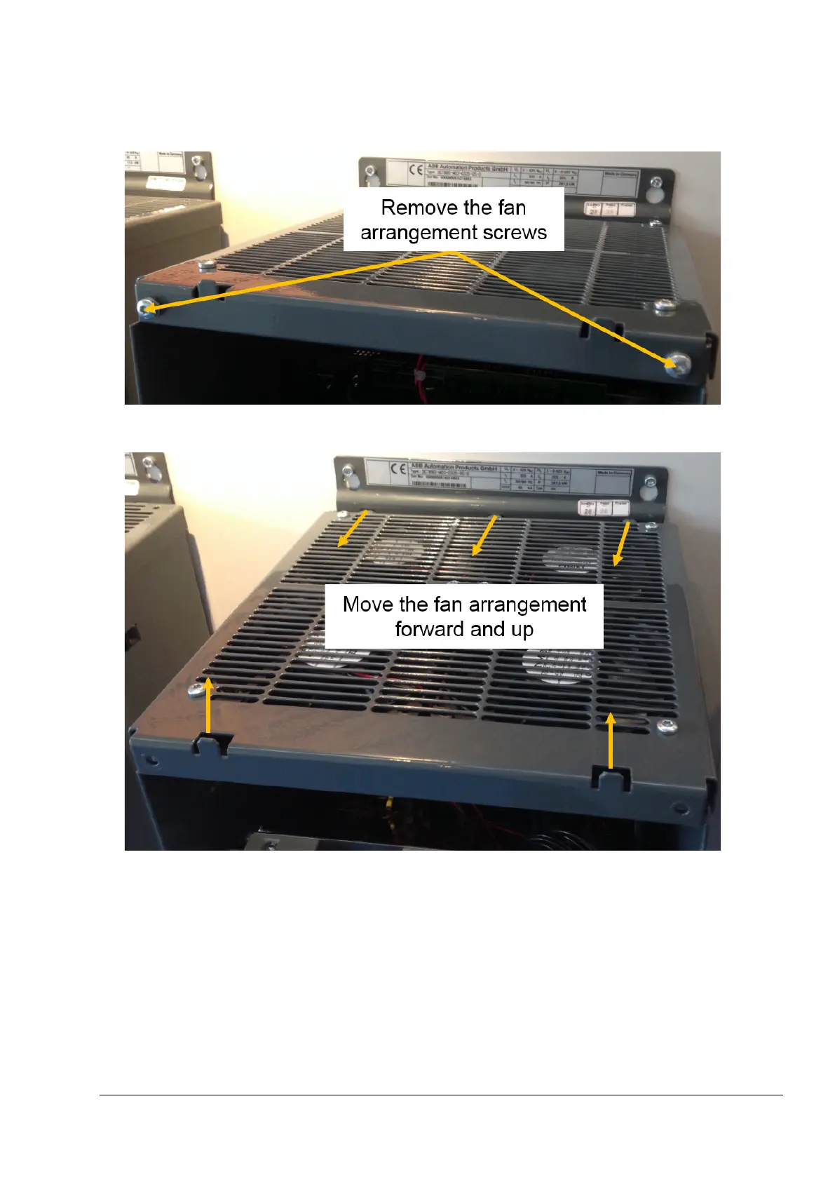 ABB DCT880 - Fan Assembly Access and Removal (T3); Remove fan arrangement screws (T3); Move fan arrangement forward and up (T3)