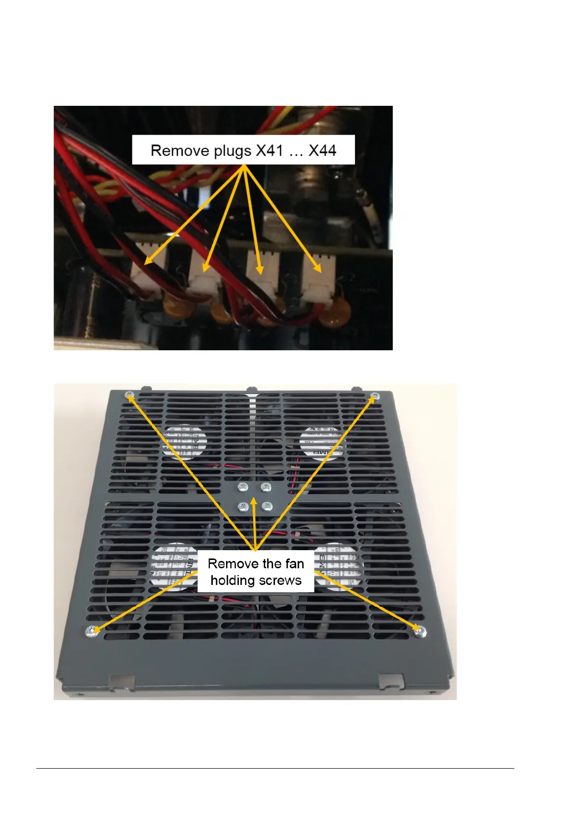 ABB DCT880 - Fan Plug and Screw Removal (T3); Remove fan plugs (X41-X44) from SDCS-PIN-H; Remove fan holding screws (T3)