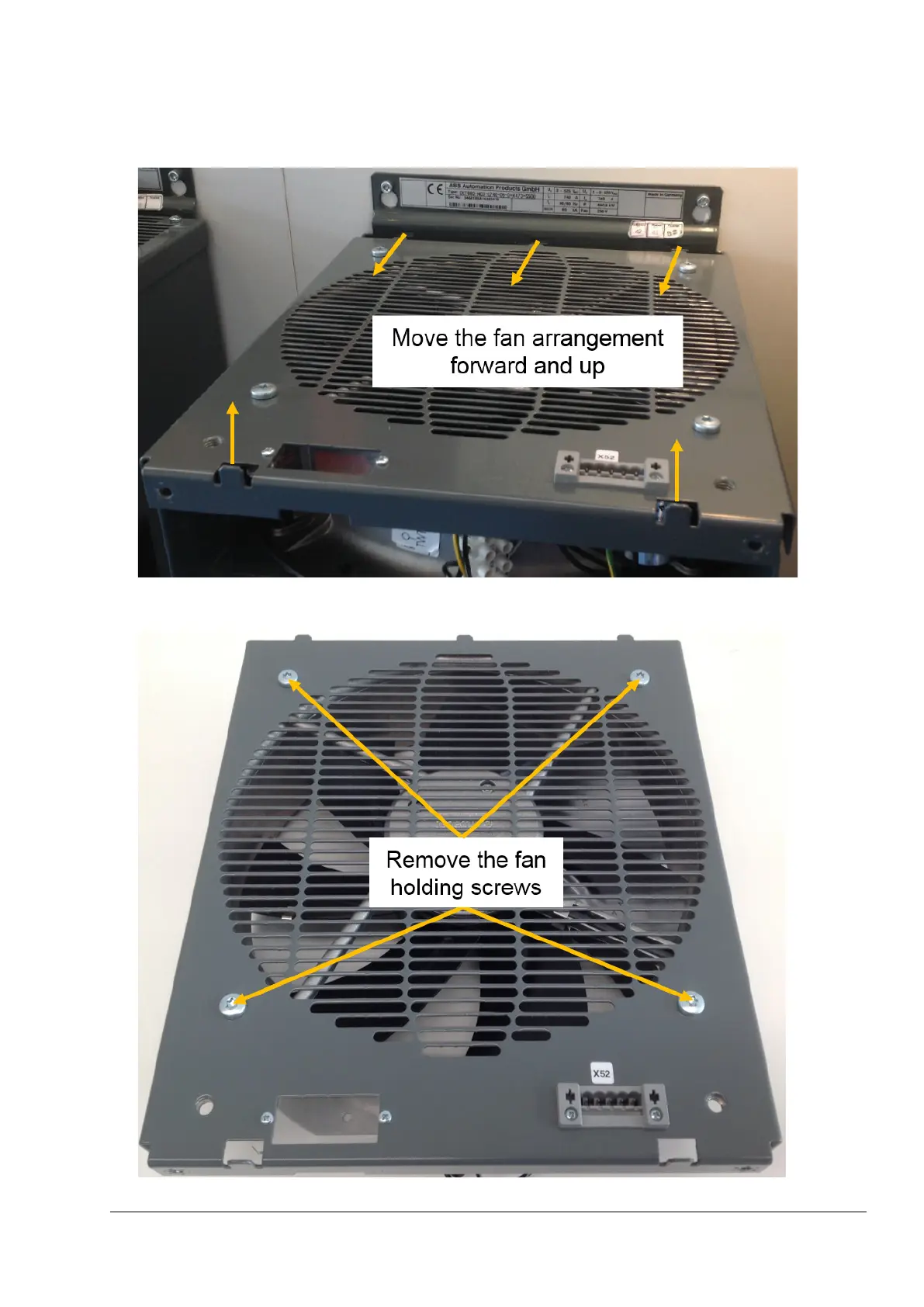 ABB DCT880 - Fan Assembly Adjustment and Screw Removal (T4); Move fan arrangement forward and up (T4); Remove fan holding screws (T4)