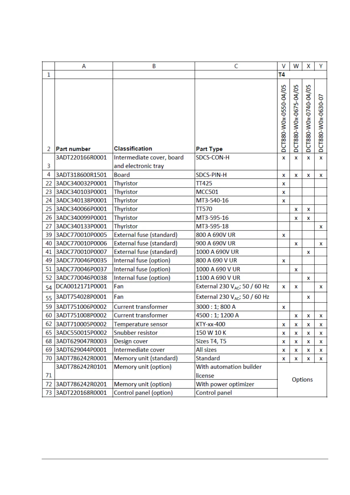 ABB DCT880 - Spare Parts List for T4 Units; Spare parts for T4 (550 A - 740 A)